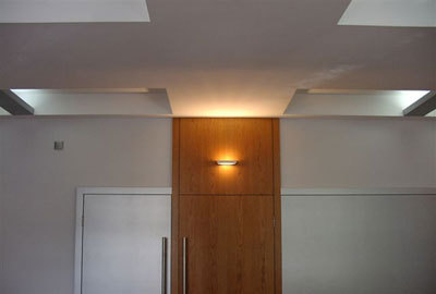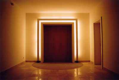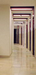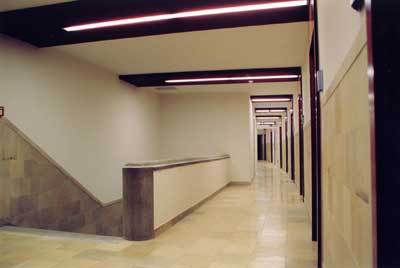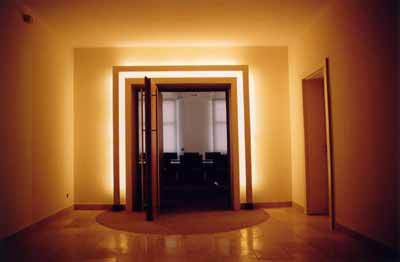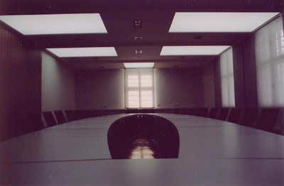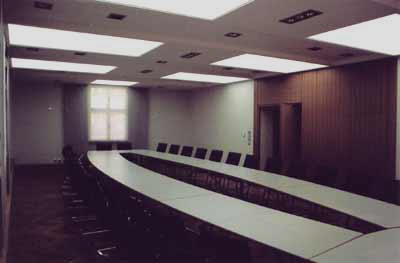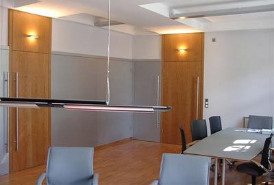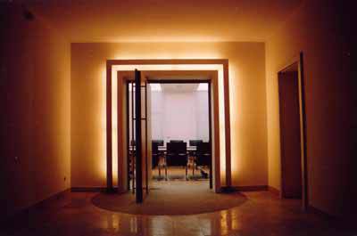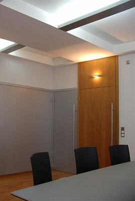 Im Zuge der Bürorenovierungen im historischen Gebäude der Kreisverwaltung wurden wir beauftragt, die Flurzonen und den Sitzungssaal neu zu gestalten. Der Auftrag umfasste die Neugestaltung der Innenwände und Decken mit Lichtplanung, außerdem die Integration der notwendigen Brandabschnitte durch Glastürelemente von Erdgeschoss, 1. - 3. Obergeschoss und Dachgeschoss. Axel Schmitt entwickelte hierzu ein Lichtdeckenkonzept, bestehend aus einer lichtdurchlässigen Spanndecke aus Kunststoff und einer abgehängten Gipskartondecke. Die Lichtfelder bilden mit den aufgearbeiteten Türen optisch eine Symbiose und zusammen mit der Oberlichtverkleidung wirken sie wie ein Band. Im Bereich des Sitzungszimmers wurden Holzfaltwand, Wand- und Deckenbeläge vollständig entfernt. Die Installationen wurden demontiert und auf den heutigen Stand der Technik gebracht. Der Sitzungsraum wurde mithilfe klarer Strukturen und variabel anzuordnenden Tischen freundlich und zurückhaltend gestaltet. Separat schaltbare Lichtdeckenfelder und zusätzliche Downlights unterstreichen diesen Eindruck. In die Gipskartondecke wurden Videoprojektor, Videoleinwand und Lautsprecher integriert. Bei Bedarf lassen sich die Geräte einfach herausfahren und über Funktastatur mit Zugriff zum hauseigenen Netzwerk steuern. Der Eingang des Sitzungssaals erhielt eine größere Tür, die ebenso wie Sideboard, Garderobe, Wartebank und andere Möbel und Einbauteile nach eigens hierfür erstellten Entwürfen von Axel Schmitt angefertigt wurden. Im Zuge des Raumbildenden Ausbaus wurden in Zusammenarbeit mit den an der Planung fachlich Beteiligten Lüftung und Heizung neu ausgelegt.